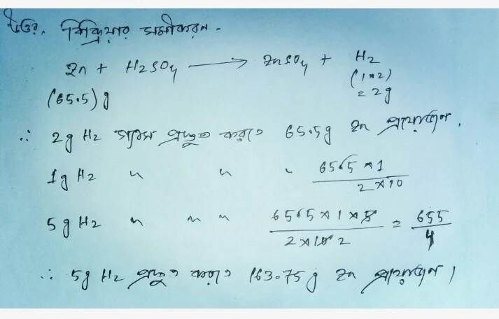 4.2 - লঘু সালফিউরিক অ্যাসিড ও জিঙ্কের বিক্রিয়ায় 5g হাইড্রোজেন গ্যাস তৈরি করতে হলে 50% বিশুদ্ধতার কত গ্রাম জিঙ্ক প্রয়োজন হবে তা নির্ণয় করো (Zn = 65.5, O = 16, S = 32, H = 1 )
